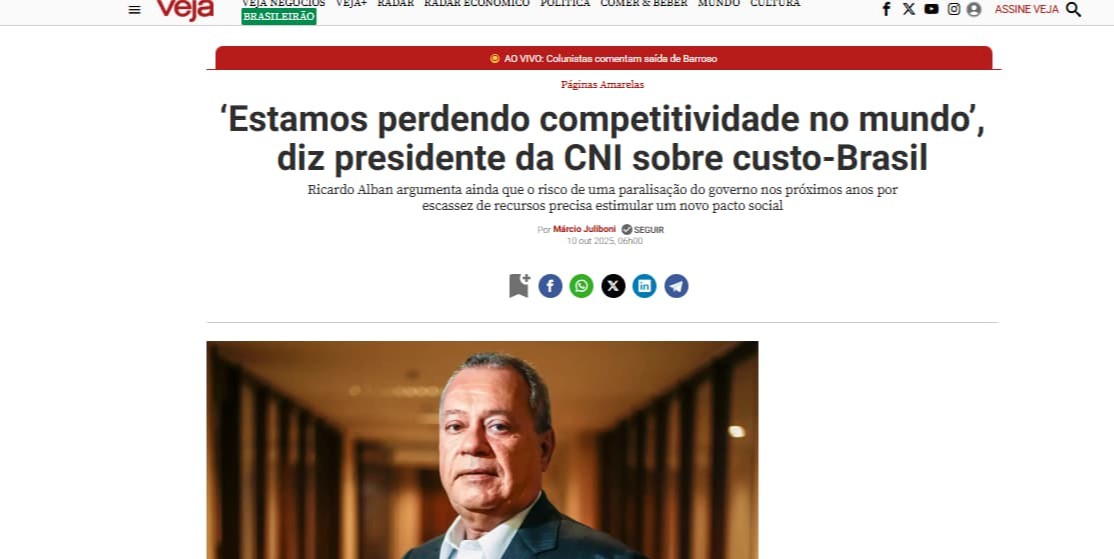 De acordo com entrevista exclusiva para a Veja, publicada no dia 10 de outubro de 2025, edição nº 2965, escrita por Márcio Juliboni, Ricardo Alban, presidente da Confederação Nacional da Indústria (CNI), destacou que a indústria brasileira perdeu espaço no cenário econômico mundial e precisa de medidas concretas para recuperar sua competitividade. Segundo ele, o setor representava 36% do PIB na década de 1980 e hoje corresponde a apenas 25%.