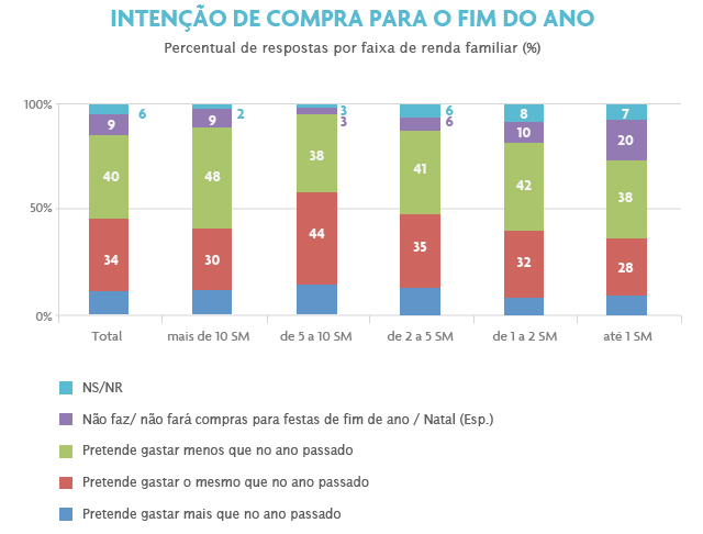 A disposição para gastar mais com as festas de fim de ano é maior entre as pessoas com renda familiar entre cinco e dez salários mínimos. Nessa faixa de renda, 14% pretendem gastar mais do que em 2012 com as compras para as festas de fim de ano. O percentual cai para 9% entre os que têm renda familiar de até um salário mínimo.