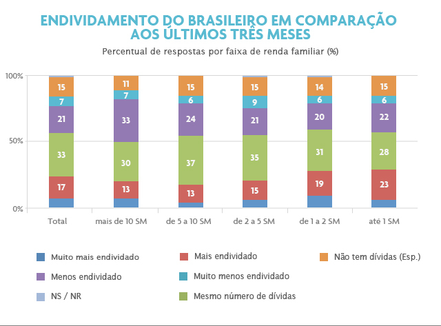 USO DO 13º SALÁRIO - A pesquisa revela ainda que 24% da população está mais endividada do que há três meses. A maior parte das dívidas (59%) foi contraída por causa de dificuldades ou necessidades imprevistas. Ou seja, foram feitas sem planejamento. O cenário de maior dificuldade econômica influencia a decisão sobre o uso do 13º salário neste fim de ano. A maioria dos brasileiros (52%) usará o 13º salário para pagar dívidas. Outros 30% usarão o dinheiro extra para despesas do dia a dia e 18% comprarão presentes e produtos de uso pessoal, como roupas, sapatos e brinquedos. Quinze por cento vão poupar.