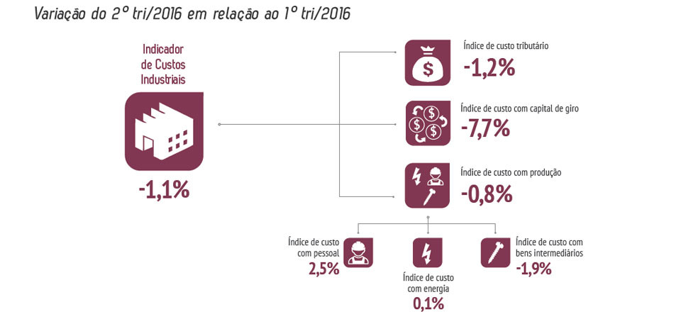 A fabricação de um produto é um processo que envolve uma série de custos . São gastos com pessoal, energia e compra de insumos. Além disso, há os custos com impostos e com o capital de giro. Todas essas despesas formam o Indicador de Custos Industriais , um estudo trimestral da CNI, que mede a evolução dos gastos da indústria de transformação brasileira com a produção dos bens. O estudo mostra que, no segundo trimestre, o indicador caiu 1,1% na comparação com os três primeiros meses do ano. Foi a primeira queda do indicador desde o terceiro trimestre de 2014.