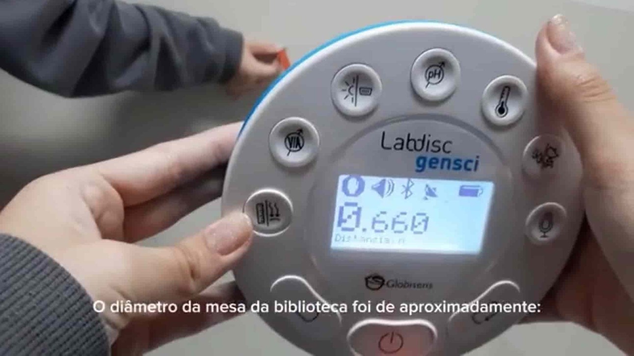 Para o Desafio Labdisc, a turma do 7º ano da professora Marilene Luiz utilizou o sensor de distância do laboratório portátil para medir o diâmetro e o comprimento de diferentes circunferências: mesa da sala dos professores, mesa da biblioteca, CDs e mesa da sala de aula.