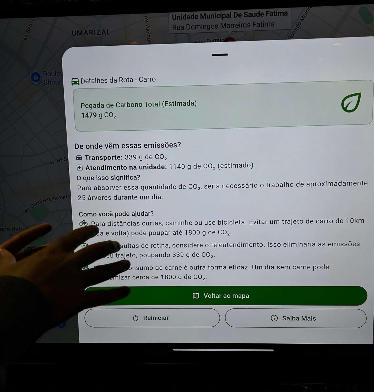 Ao final, o sistema informa se há necessidade de procurar uma unidade de saúde e apresenta um panorama dos serviços mais próximos à localização da pessoa. Além disso, lista meios de transporte disponíveis e calcula a pegada de carbono de cada opção, permitindo que o usuário escolha a alternativa menos poluente.