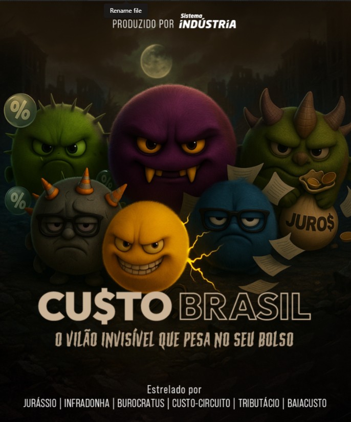 De forma lúdica, a CNI apresenta seis personagens que são os principais fatores para a conta de R$ 1,7 trilhão por ano desperdiçados no Brasil, de acordo com dados do Observatório Custo Brasil (OCB). Jurássio, o monstro que representa a alta taxa de juros; a Infradonha, com o custo das obras paradas e as consequências da ausência de ampliação e diversificação da matriz logística; o Burocratus, com a morosidade da burocracia; Custo Circuito, que representa o valor da energia para lares e empresas; o Tributácio, mostrando que os tributos estão por todos os lados; e o Baiacusto, que reúne o peso de todos eles, representando as perdas do Custo Brasil.