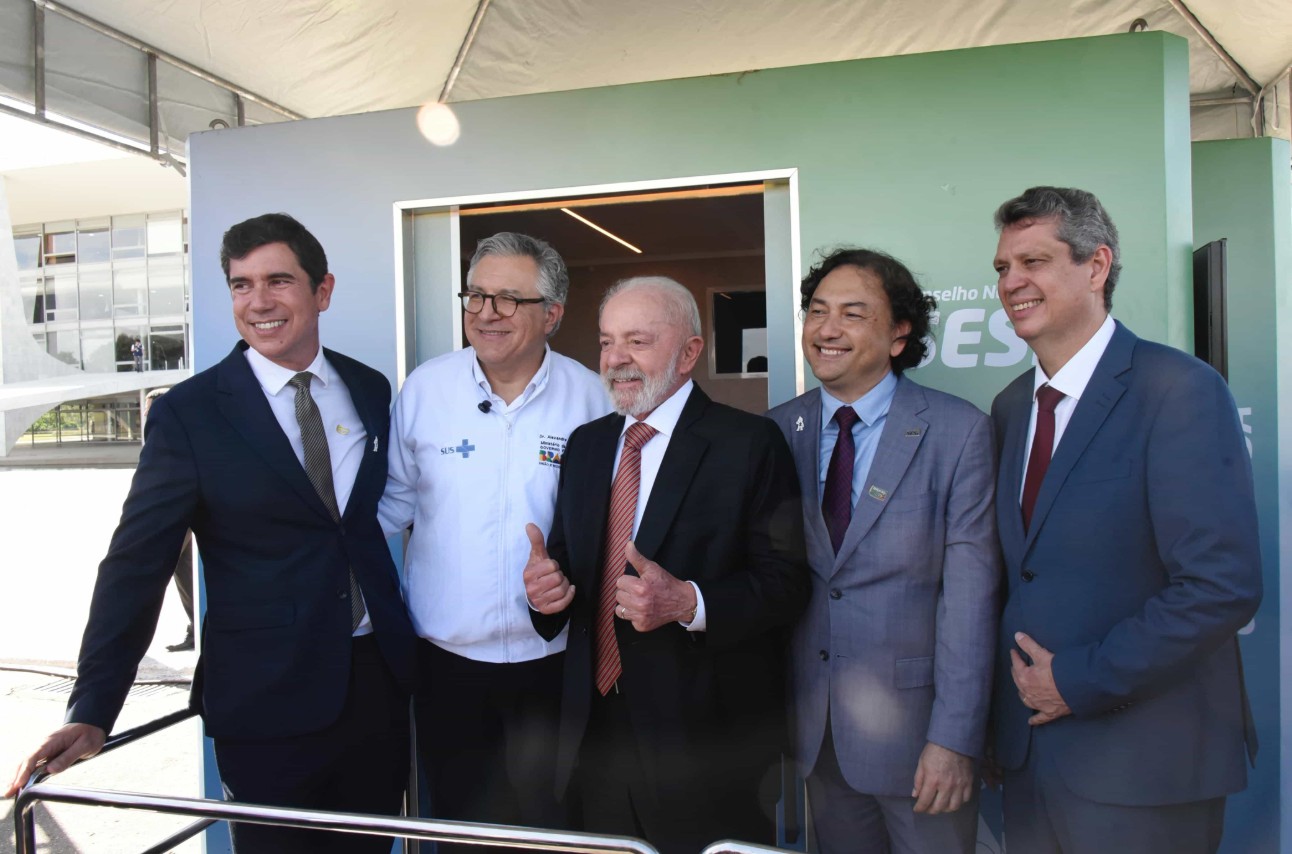O presidente da República, Luiz Inácio Lula da Silva (PT), conheceu, nesta sexta-feira (30), a Estação SESI Saúde Conectada, após o lançamento do programa Agora Tem Especialistas, no Palácio do Planalto, em Brasília. A estação de telessaúde é uma iniciativa inovadora do SESI que busca ampliar o acesso dos trabalhadores da indústria a serviços especializados de saúde, por meio da tecnologia. O projeto piloto já está presente em cinco estados e atende a 1 mil trabalhadores. Na ocasião, o ministro da Saúde, Alexandre Padilha, também esteve presente.