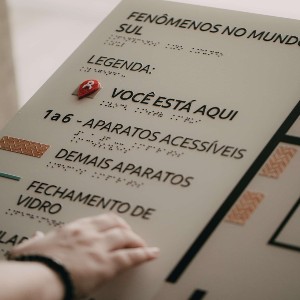 - Maquetes táteis e plantas elevadas que permitem reconhecer a construção arquitetônica do edifício