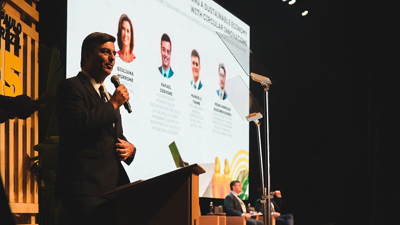 Rafael Cervone, presidente do Centro das Indústrias do Estado de São Paulo (CIESP) e vice-presidente da FIESP, apontou as dificuldades enfrentadas pelo setor produtivo para viabilizar economicamente a circularidade, destacando a necessidade de reformas e incentivos.
